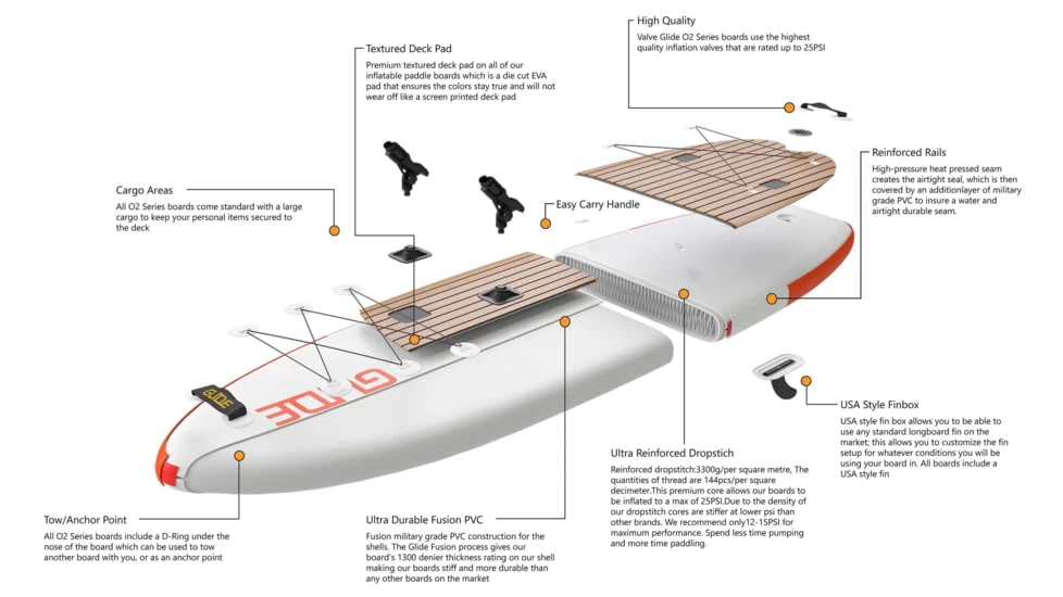 The Glide inflatable Angler paddle board is the answer to all your fishing woes. The extra-wide body and flat bottom provide ultimate stability for reeling in your next monster catch while the 500 lbs carrying capacity, deck mounts, and extra bungees mean that you can take all the gear youll ever need on your next fishing excursion. The O2 Angler is a perfect inflatable paddle board for fishermen/women who have limited space for storage, but endless places to travel.![]()