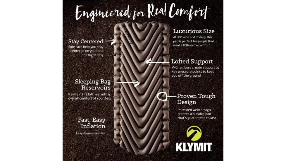 The Klymit Static V Luxe is the newest addition to the Static line of sleeping pads. It represents a landmark in sleeping pad comfort, matching a massive and stable bed to a tiny pack size and an incredibly light weight. This pad makes you feel like you are sleeping in your bed at home. At an incredible 30 inches wide it fits two sleepers or a luxurious amount of rolling room for one. It features the v-chamber design which limits air movement and heat loss while offering a uniquely ergonomic body map which is optimized for performance and comfort. Inflating via two mouth valves in approximately 20-30 breaths, it will save you time and energy while still providing luxury wherever you are.![]()