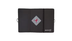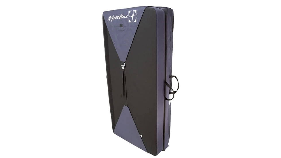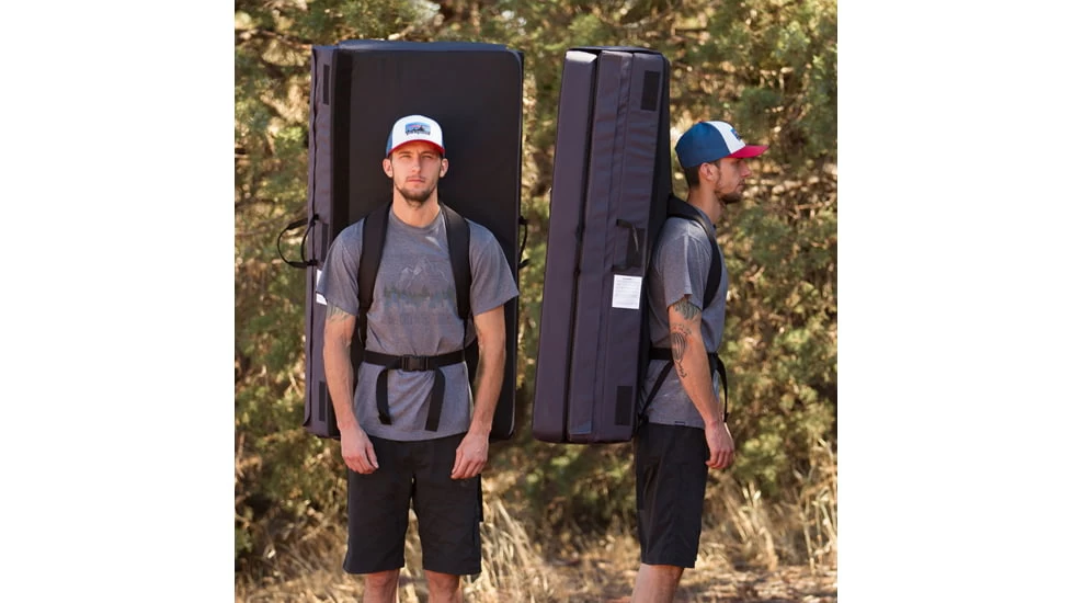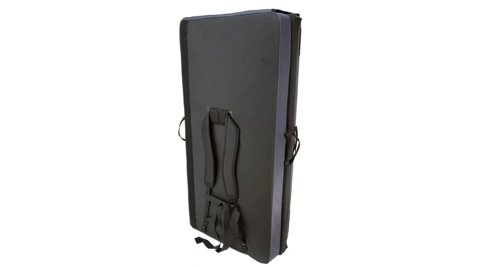 A massive 4′ x 6′ (1.2 m x 1.8 m), in an easy-carrying, tri-fold design. Sandwich foam design for maximum impact absorption: 1″ (25 mm) closed-cell, top layer, 2.5″ (60 mm) open-cell center, and ?” (15 mm) closed-cell, base layer. 900d body fabric for maximum durability and cross-clipper logo rug for cleaning shoes. Angle cut hinges eliminate the gutter found in other designs, and a small external stash pocket and larger inner pocket provide a place to store shoes, chalk bag, etc. Closure flap reverses to cover shoulder straps while bouldering. Plush padded shoulder straps and dual sets of drag handles give you lots of carrying options. Aluminum buckles are guaranteed for life. The Magnum also makes an awesome crag bed for car camping!![]()