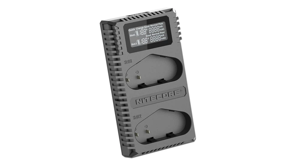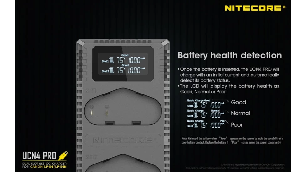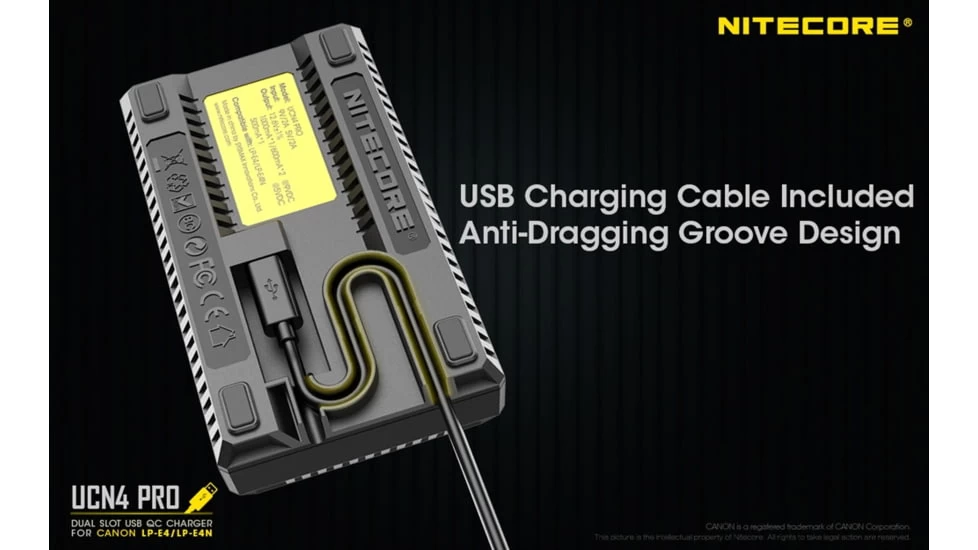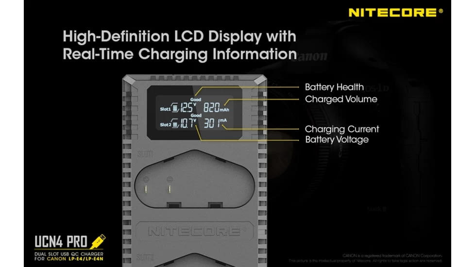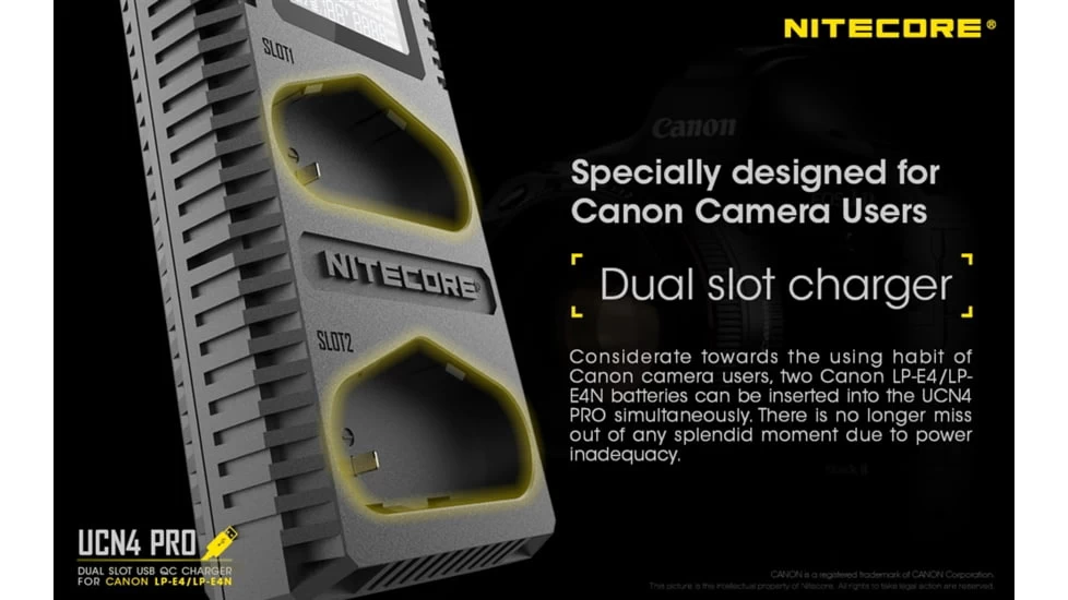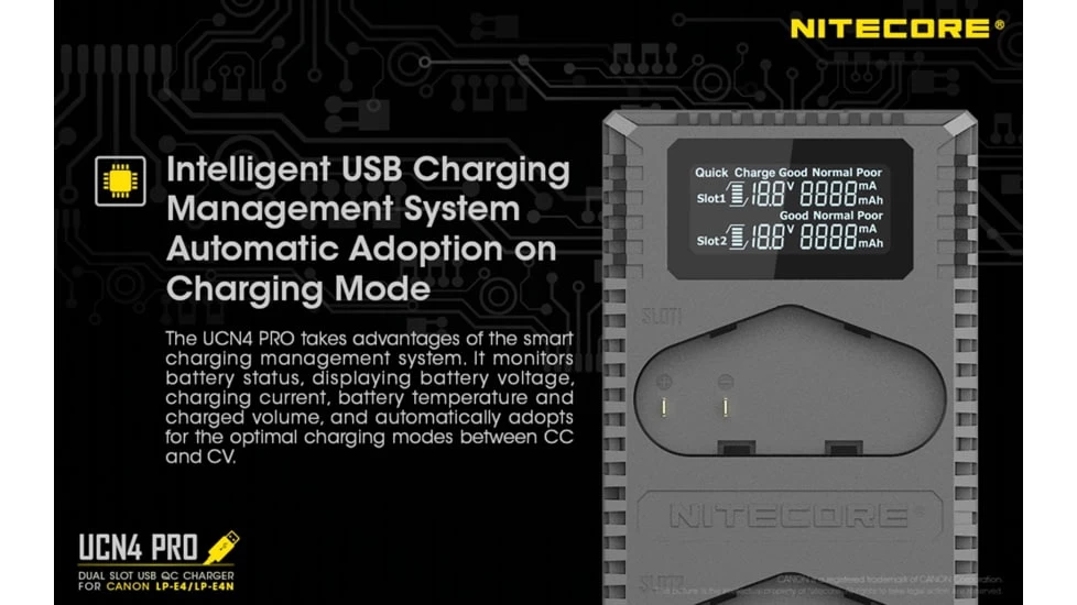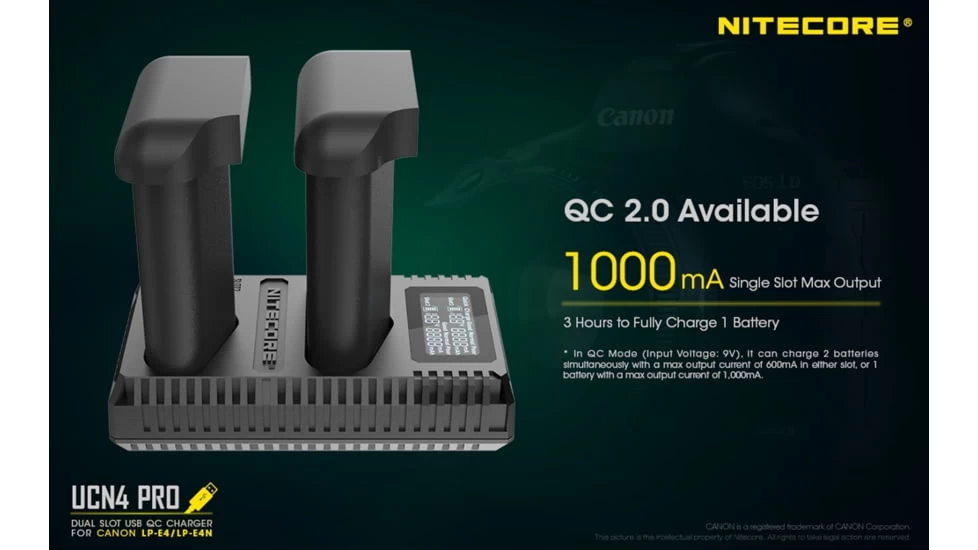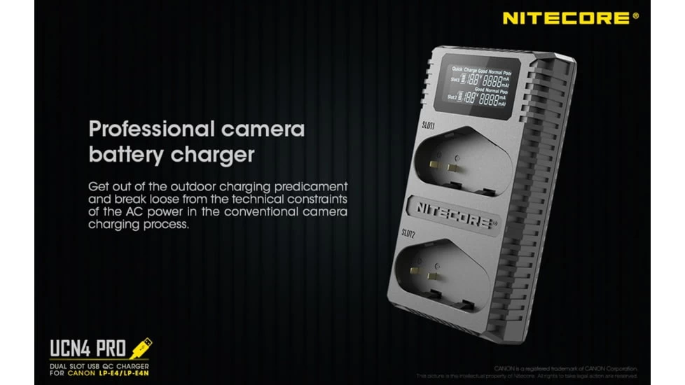 Introducing the Nitecore UCN4 PRO Dual-Slot USB QC 2.0 specifically designed to recharge compatible Canon LP-E4/LP-E4N camera batteries. Designed to be quick and efficient, the UCN4 can achieve max 1000mA charging current in each slot. The dual slot design of the UCN4 lets you charge two batteries simultaneously, so you can spend less time charging and more time capturing photos. Compact and highly portable, the UCN4 weighs just over 3 ounces and measures less than 5 inches in length making it the ideal solution for portable charging without taking up extra room in your bag. Easily monitor your battery health, voltage, charging current, temperature and more using the brightly lit high definition LCD display. No need to worry about overcharging your batteries as the UCN4 offers an intelligent USB charging management system that automatically applies the correct charging current and prevents damage caused by improperly inserted batteries. Compatible with universally available USB power sources like laptops, adapters, and solar panels, the UCN4 is the perfect charger for travel and daily use.![]()