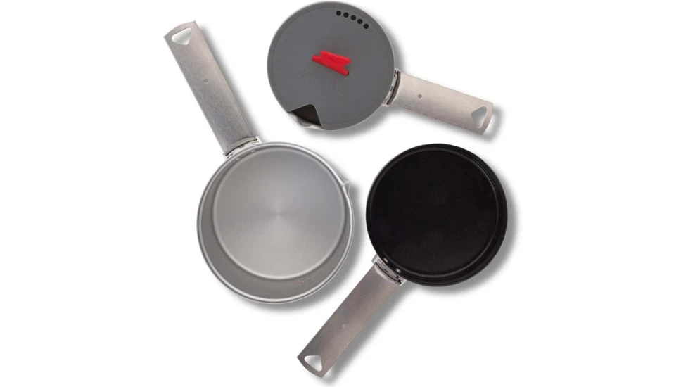 Boil water, for pasta or your freeze-dried meal, in either pot. The 0.6L size offers a lid with strainer and handle. The 1.0L includes the pot, a fry/pan lid with a non-stick ceramic coating, and two handles. Or bring everything with the Set, including 2 pots, a fry pan and three handles. All handles are removable and can be configured in numerous ways to make cooking easier or can secure everything together when packed.