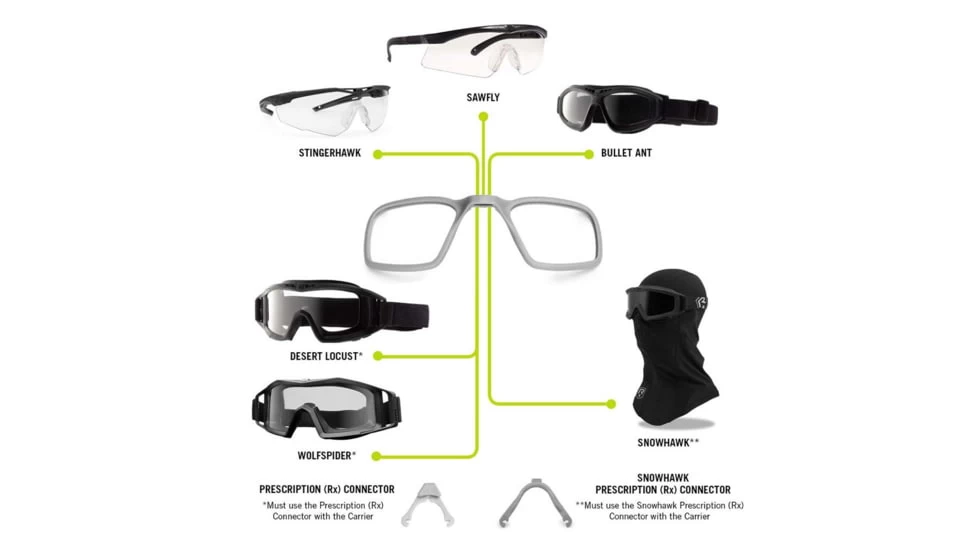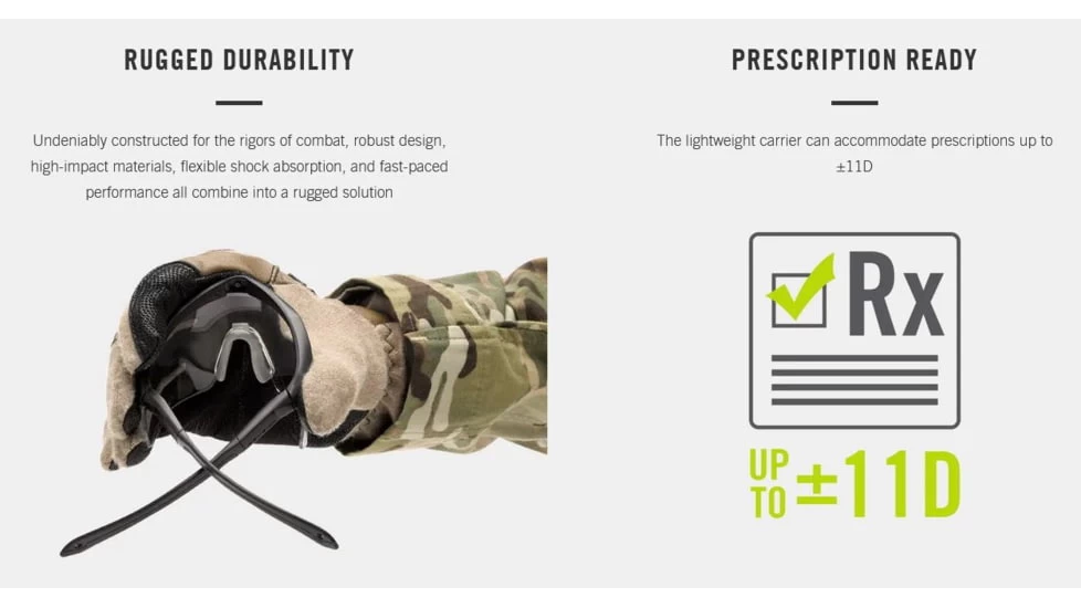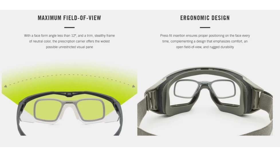 MAXIMUM FIELD-OF-VIEW: With a face form angle less than 12, and a trim, stealthy frame of neutral color, the prescription carrier offers the widest possible unrestricted visual pane;