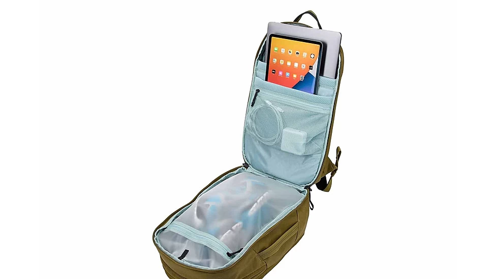 The bag’s back panel fully unzips and opens like a suitcase for easier packing. Inside, a stowable divider with TPU lining helps to organize your gear while keeping moisture, odor, or dirt from spreading to contents in the rest of the bag. The travel backpack also has dedicated areas for electronics storage and a water bottle pocket. The Thule Aion Sling (sold separately) can be used with this backpack as a hip belt to bear extra weight and provide quick access to vital items.