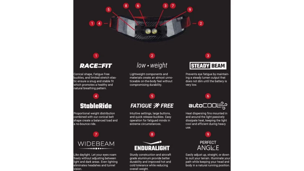The Lumen 800 Multisport is perfect for an adventurer who does it all. The light has 2 spot cones that create a wide angle and project a more focused beam further ahead of you for fast paced adventures. This light features UltrAspire 3D Lighting which casts shadows across uneven surfaces giving you a better understanding of your terrain. This light comes equipped with with our Race Fit which is a fatigue-free buckle system. The light itself can be removed from the belt and attached to the included UltrAspire bike bracket and will mount onto 31.8mm and 35mm handlebars. It can also be attached to our headlamp band giving the Multisport a wide range of versatility. The high, medium, low, and blinking settings allow you perfect control. This light includes one of our UltrAspire rechargeable batteries and features a USB charging port. Includes a USB charging cable, bike bracket, and head strap attachment.![]()